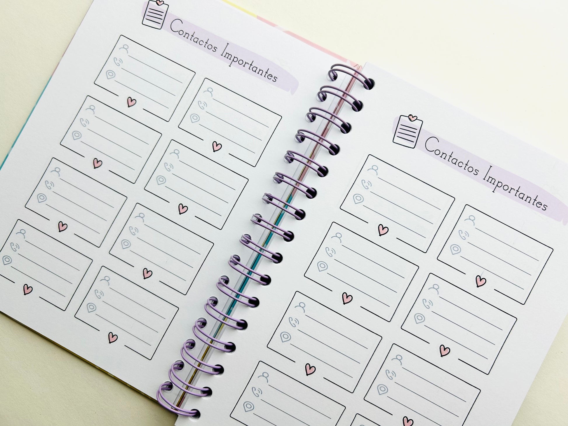Un cuaderno pensado para acompañarte en tu día a día, ayudarte a organizarte y registrar lo importante con calma y orden. Cada página está diseñada para anotar ideas, gastos, frases, contactos y fechas importantes, convirtiéndose en un apoyo práctico y visual para tu rutina.